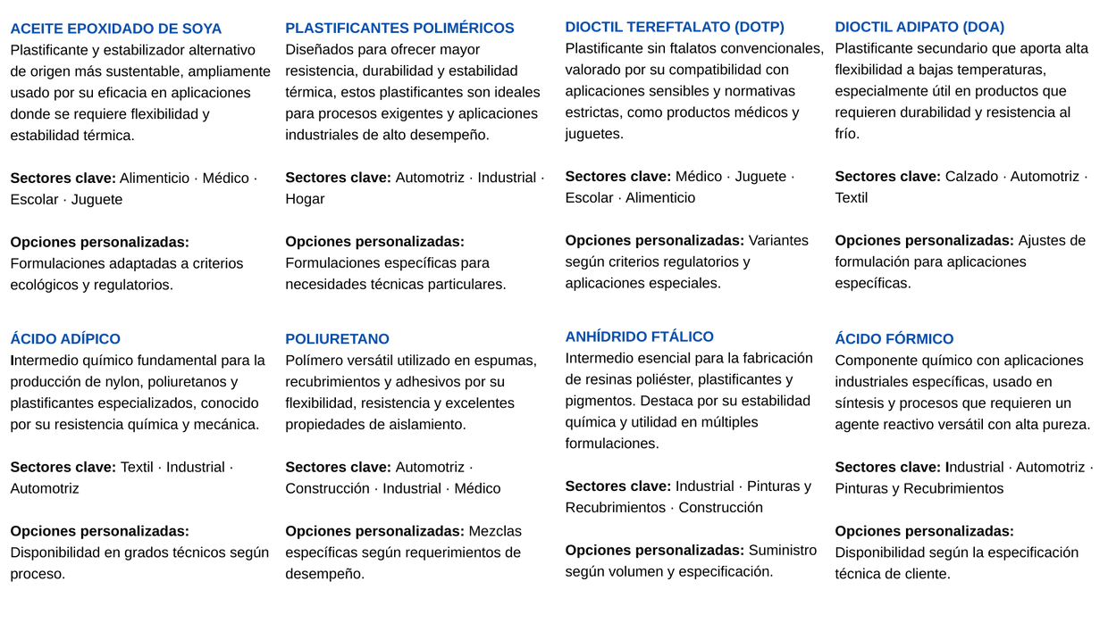 Somos especialistas en el manejo de plastificantes y materias primas para todo tipo de aplicaciones, con enfoque en desempeño, consistencia y suministro confiable.